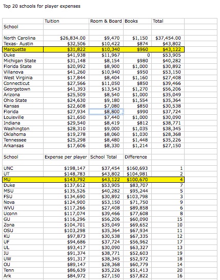 One of the things that caught my eye was the crazy amount spent per player. Marquette ranked third nationally on the list, spending $143,792 per basketball player. @Brewtownandy (Andy Fleck) made a comment asking how it would looked adjusted for tuition, so I had to oblige.