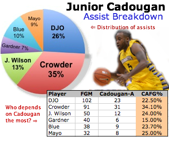 The pie chart in the upper left hand side is the distribution of assists. In other words, who was receiving most of Cadougan’s helpers. As it turns out Junior feeds Jae Crowder most — 35 percent of the time — and Darius Johnson-Odom second most — 26 percent of the time — while Jamil Wilson receives 13 percent of Cadougan’s helpers.