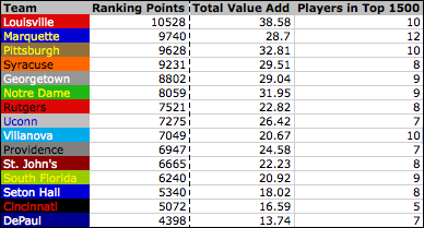 With that out of the way it’s time to get to the good stuff. I took Pudner’s top 1500 returning players including defense — found here— and grouped them by teams to see which Big East teams had the most firepower coming back. I then assigned the inverse rank to each player (so a player ranked second would get 1498 points and one ranked 1498 would get 2) and added up the totals.
