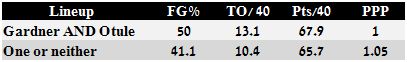 Along with simply playing more possessions against ball handlers and shooters, Gardner is allowing fewer points per possessions and opponents’ field goal percentage are down more than 6.5 percentage points from a year ago. We knew Gardner was better defensively this year, but these numbers are eye-opening.