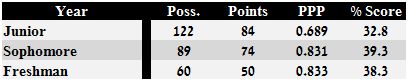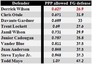 Derrick Wilson, although playing 13.3 minutes per game, is both Marquette’s best on-ball defender in terms of points per possession allowed and field goal percentage defense. Talk all you want about his ugly offensive numbers (1.3 points, 1.8 assists), but his defense is getting it done for the Golden Eagles. Note that these numbers include both man and zone defenses.