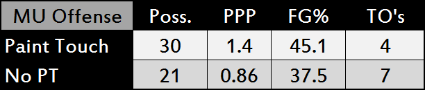 In that 61-possession game, Marquette had 51 possessions that didn’t involve fouls in the bonus (Syracuse fouled the last two minutes off missed shots). Of those 51 possessions, here’s how the unofficial paint touch situation broke down: