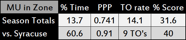The points per possession and percent of the time Syracuse scored were higher than Marquette defense season averages, but that includes time in zones against non-conference opponents who weren’t going to play as well as Syracuse did.