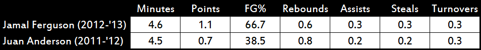 Ferguson was also a solid defender, as his opponents shot 6-for-17 from the field. His sneaky quickness helped him, and his rebounding was excellent for his role and minutes. If this sounds extreme for a guy who played in just 14 games, compare Ferguson’s freshman statistics to Juan Anderson’s a year ago.