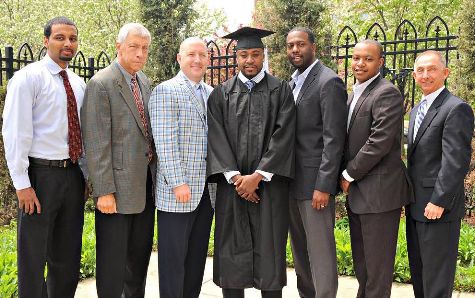 Junior Cadougan poses for a photo with Marquette’s coaching staff after graduation. (Courtesy: Marquette Athletics via Twitter)