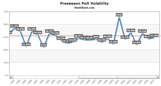 Indeed, the graph above from Statsheet.com shows the volatility between the first and final AP polls the past 20 years. More often than not, where a team started won’t be where it finishes.