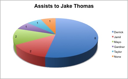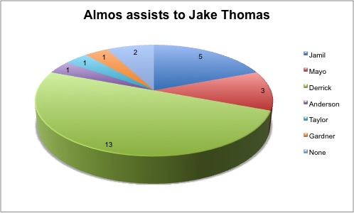 As might be expected, Derrick Wilson has been the main provider for Thomas this season, assisting over half of his makes and exactly half of his misses. Jamil Wilson and Todd Mayo come next. Taken together, the three have provided all but five of Thomas’ assisted 3-point attempts. The big men are almost a non-factor.