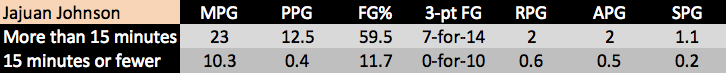 Here’s the brass tacks on Johnson: he’s averaging 15.4 minutes per game this season. In six games he has played more than 15 minutes; in the other nine (two DNP-CD’s) he’s averaged fewer than 15. Here are those splits: