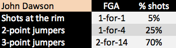Consider this: Dawson has attempted 20 shots in his first season. Just one of those has come at the rim.