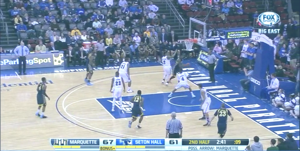 His biggest moment of the game occurred with less than 3 minutes to go. Marquette led by six, 67-61, facing full-court pressure from the Pirates. Wilson broke the press and initiated the offensive set with a pass to Gardner on the left wing.