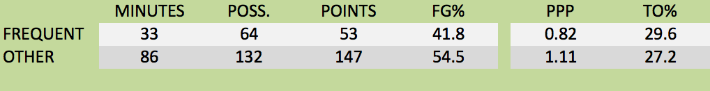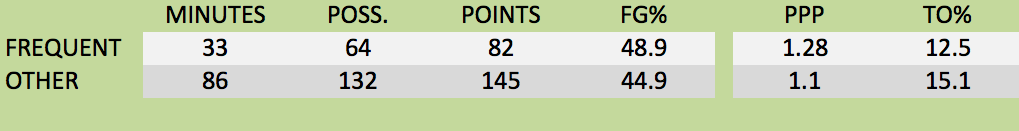 And in those 33 minutes and 23 seconds, here’s how the Marquette offense has fared, compared to when Williams uses any other lineup. For clarity, we’ll call the Wilson/Mayo/Thomas/Wilson/Gardner lineup “FREQUENT,” and all other lineups will be “OTHER.”