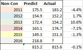 The predict column is the average of the ranking of all the Non-Con opponents from the year before (so the numbers we are currently discussing for the 2016 season). The actual is where that average ended up. Although we see fluctuations every year, on the whole, they don’t overestimate or underestimate by much, if at all.