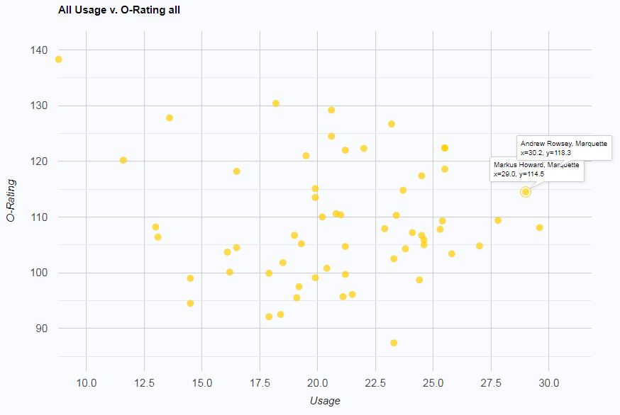In Marquette’s recent history (since 2008), no other player has played over 30 minutes with a usage rating over 45% like Howard’s. Not Rowsey nor Ellenson nor Carlino even cracked 40%. The next highest single game usage at 30+ minutes was Duane Wilson against Tennessee his freshman year, when he used 43.4% of possessions in his 31 minutes.
