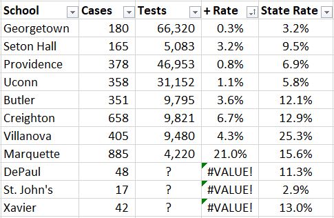 As for the status of the Big East, most in-person classes remaining will end this week, so this will be our final update for a while. The situations on campus are much worse than at the start of the year, though still relatively successful compared to the communities and states each institution resides in.