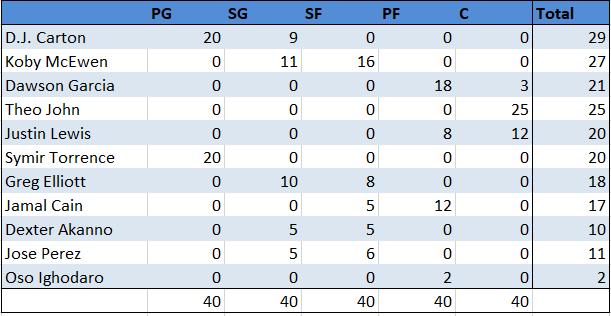 As the two most talented guards, Carton and McEwen are the easiest calls to see heavy minutes. Both can create shots for themselves and others, defend 1-3, and have the offense run through them.