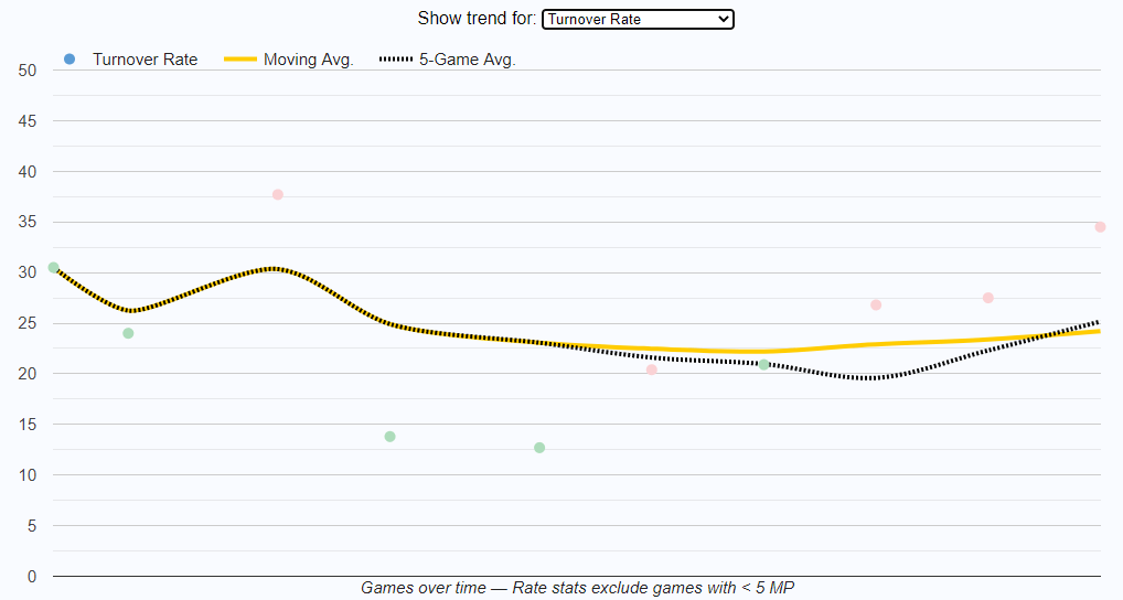But for all the heroics and eye popping play, the turnovers, which are to be expected from a lead guard with so much P&R responsibility, are getting worse instead of better.