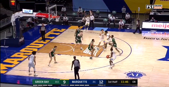 For starters, he will never be a scoring guard and Marquette doesn’t want or need him to be. But he has to be able to hit the completely, absurdly wide open spot up shots teams are giving him. And he hasn’t. He is only 2-12 on spot ups this season, and that number is only 2-9 in unguarded situations. That 0.667 PPP on unguarded spot ups ranks 534th out of 600 players on Synergy.