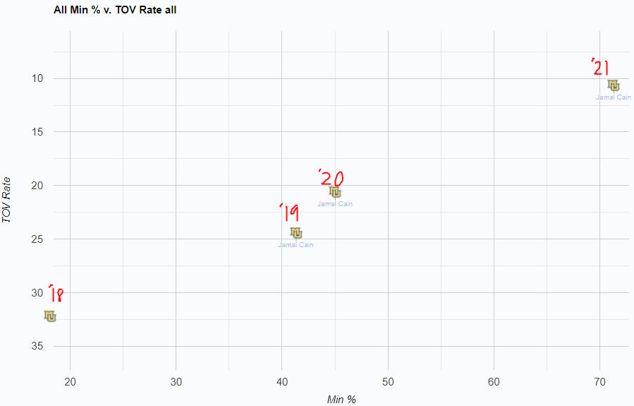 Rationale: I have a lot to say about Jamal so far this season, almost all of it good (hence the grade), but I wanted to start with the Turnover Rate numbers because I think it best encapsulates how much he has grown this season.