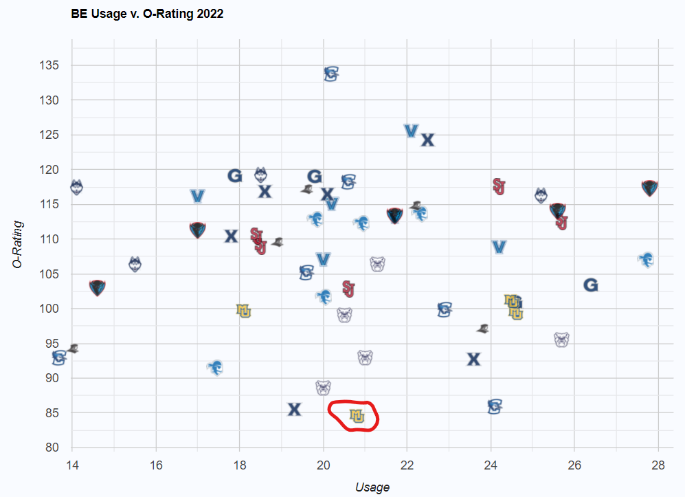 Those stats on pretty much any team in the country would be highly valued, but the fact that he’s doing it at Marquette ups the ante. We mentioned the middling offensive ranking, but the shooting in particular is a tremendous sore spot. The 31.8% average from distance is 231st in the country. If you take away Kolek’s lowly average, it does go up to 33.8%, still in the mid 100s. It isn’t like he’s passing to a team filled with snipers.