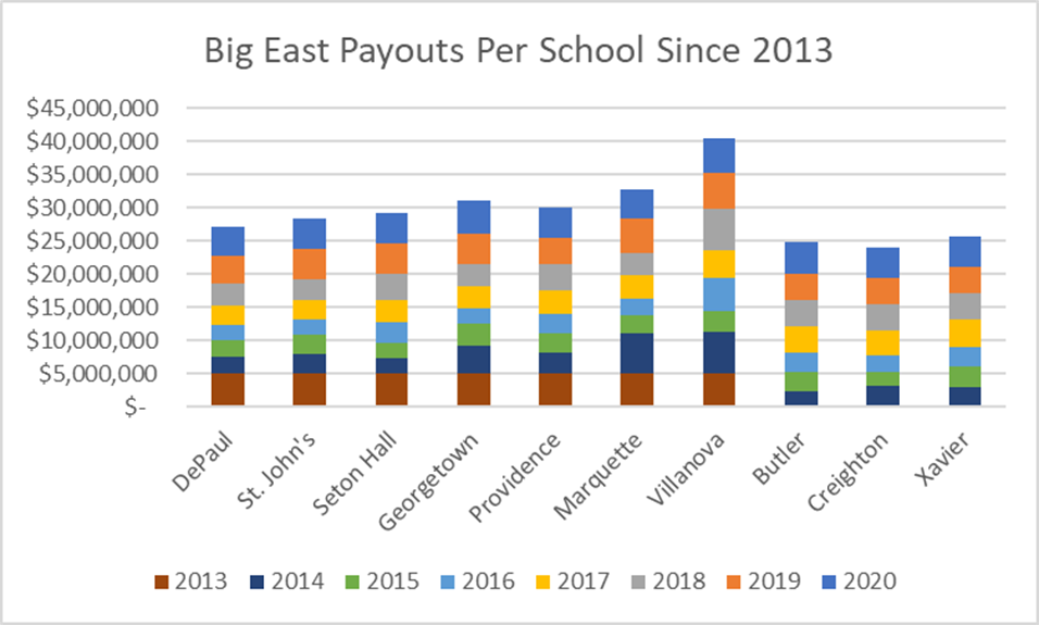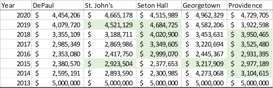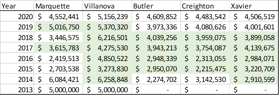 And if you’re wondering why Butler, Creighton and Xavier are all lower than DePaul, it’s because I included a 2013 “signing bonus” to the Catholic-7 teams for breaking off from the now-AAC. This turned out to be $5 Million per team.