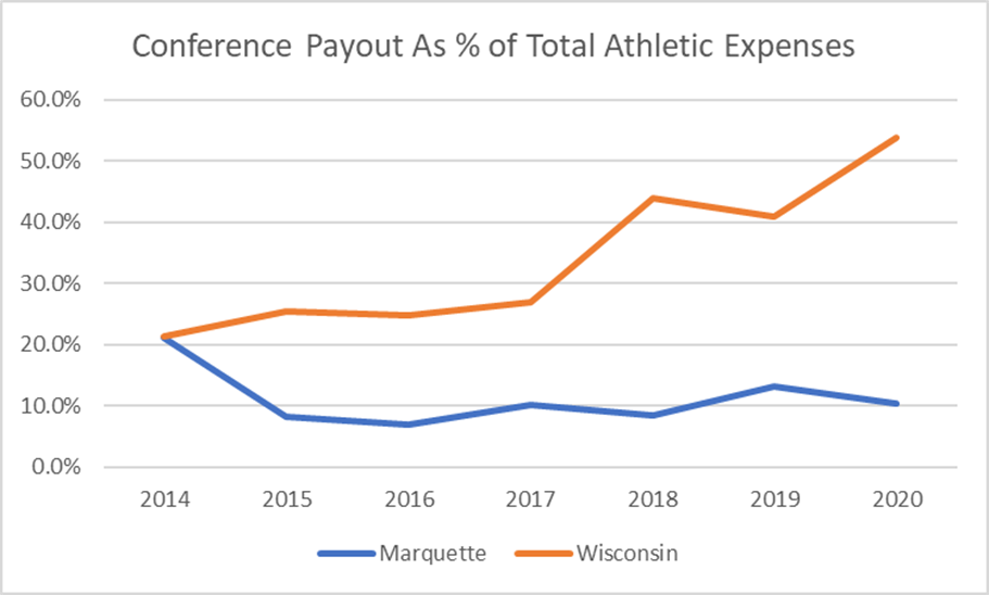 But wait, there’s more. In that same time frame, Marquette’s payouts from the Big East have gone down by 17% (from $6.1M to $5M) so that means Marquette has to pay a bigger portion of the AD expenses out of its own pocket. Whereas Big East payouts covered 21% of expenses in 2014, they now only get to 13% of the total.