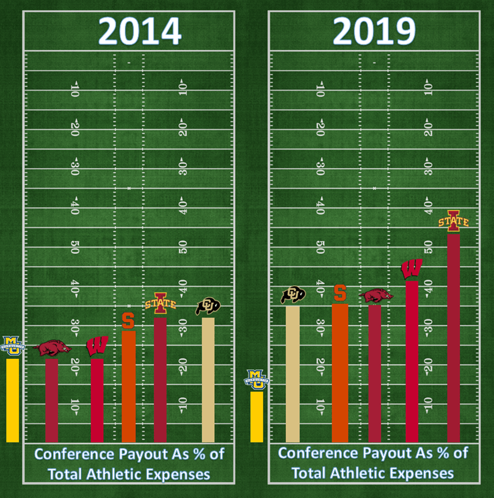 We already mentioned UW’s expenses remained relatively flat, but now factor in that their payout from the Big Ten has gone up 101% to $55 Million from 2014 to 2019, you can clearly see how that divide is growing. Whereas both MU and UW covered 21% of their expenses simply with conference payouts in 2014, MU went down while UW nearly doubled what it could cover, up to 41%. That means MU is getting much more dependent on internal institutional support while UW is much less reliant. If the B10 does indeed double their next TV contract to $1Billion+ as most expect, we’ll likely see those payouts near $100M which would cover over 75% of expenses.