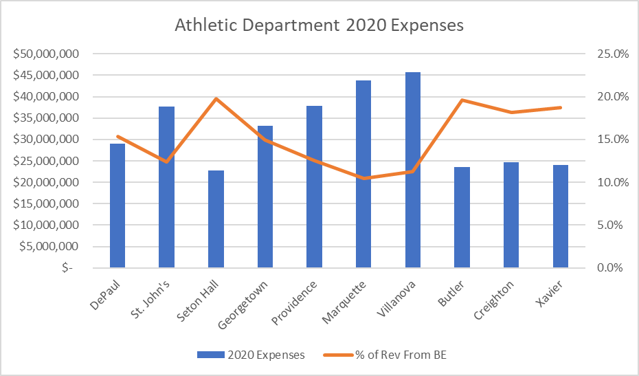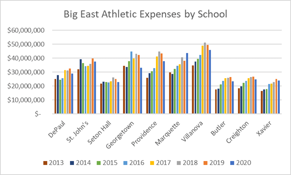 (Editor’s note: The DOE data about to be cited is notoriously unreliable when using to cross compare between schools due to differences in accounting methods. A school like MU might account for Fiserv expenses under the athletic department while a similar school like Xavier categorizes Cintas expenses under the school’s, not the AD’s ledger, so isn’t reported to the DOE as an athletic expense. In any case, it’s the best we have.)