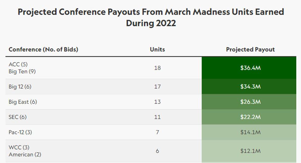 For those that need a refresher, each NCAA Tournament game appearance by Big East teams earns the conference a predetermined sum over a 6-year period. Sportico calculated that the 2022 units will be worth about $2.02M over the next 6 years, meaning the conference will collect over $26M spread out from 2023 to 2028.