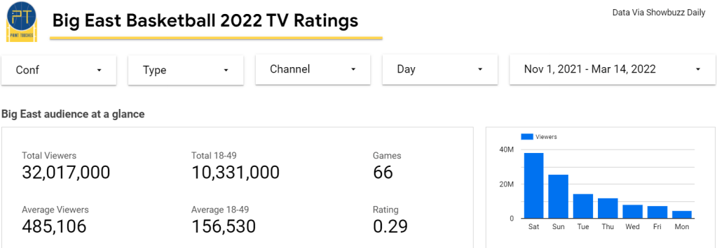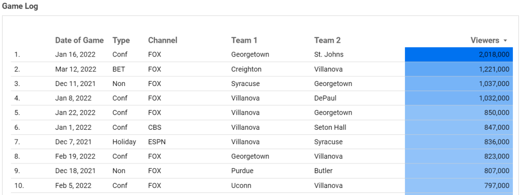 I like to add some context to data heavy posts, and it’s in the process. But in the meantime, feel free to explore the Big East’s TV ratings from the 2022 season on your own.