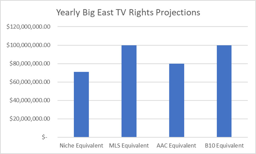 But if we want to ballpark a new Big East deal just using the average growth of these niche leagues, we’d end up at around $71 million a year.