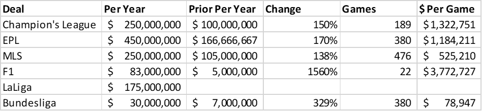 Although I can’t quite pinpoint the article, I’ve read a few times that streaming services like Apple and Amazon have to bid almost twice as much as linear broadcasters for the same TV rights packages due to lower viewership numbers. And seeing as the MLS deal is an Apple exclusive, and that FOX showed no desire to engage MLS in contract negotiations, halving that amount right off the bat is a decent starting point.