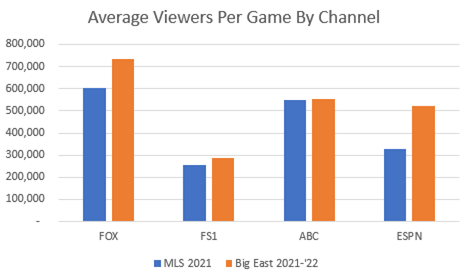 For our purposes, the MLS deal is an absolute perfect foil for the Big East. They aren’t the most popular league in the sport they play. They don’t have an overwhelming national presence. Most importantly though, they both had games on overlapping networks, which makes it much easier to cross compare results.