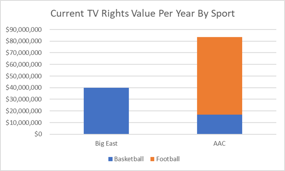 Using our back of the hand 80/20 heuristic, where 80% of the TV revenue is due to football, that would leave us with about $16 million a year devoted to basketball, compared to the Big East’s current $40 million a year average. Is the Big East basketball really currently worth twice as much as AAC basketball? Yeah, I’d say the ratings bore that out.