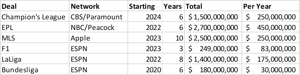 I added F1 there as well as it’s one of the fastest rising pieces of sports content, while still being incredibly niche. Also, while most headlines will reference the big “TOTAL” numbers in headlines, it makes much more sense to compare per year numbers rather than sum totals because there are pretty large differences in lengths of the contracts.