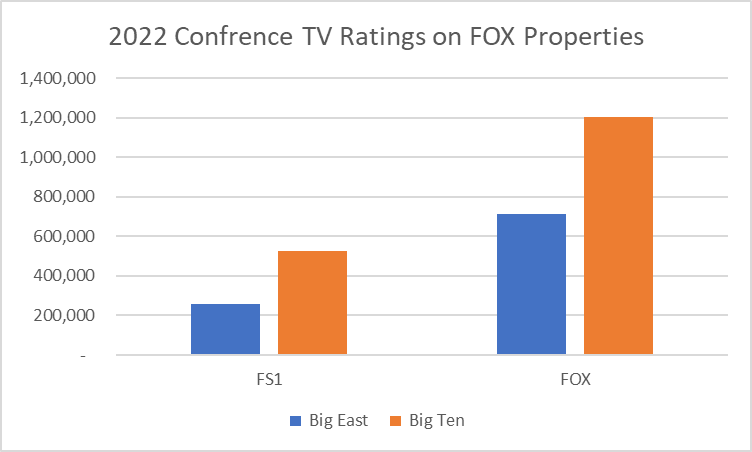 Adding the Big East conference ratings back in, the rated games drew in about 49% of Big Ten averages on FS1, and about 59% on big FOX. A reasonable inference here would be that Big East rights are about half as valuable as Big Ten basketball rights.