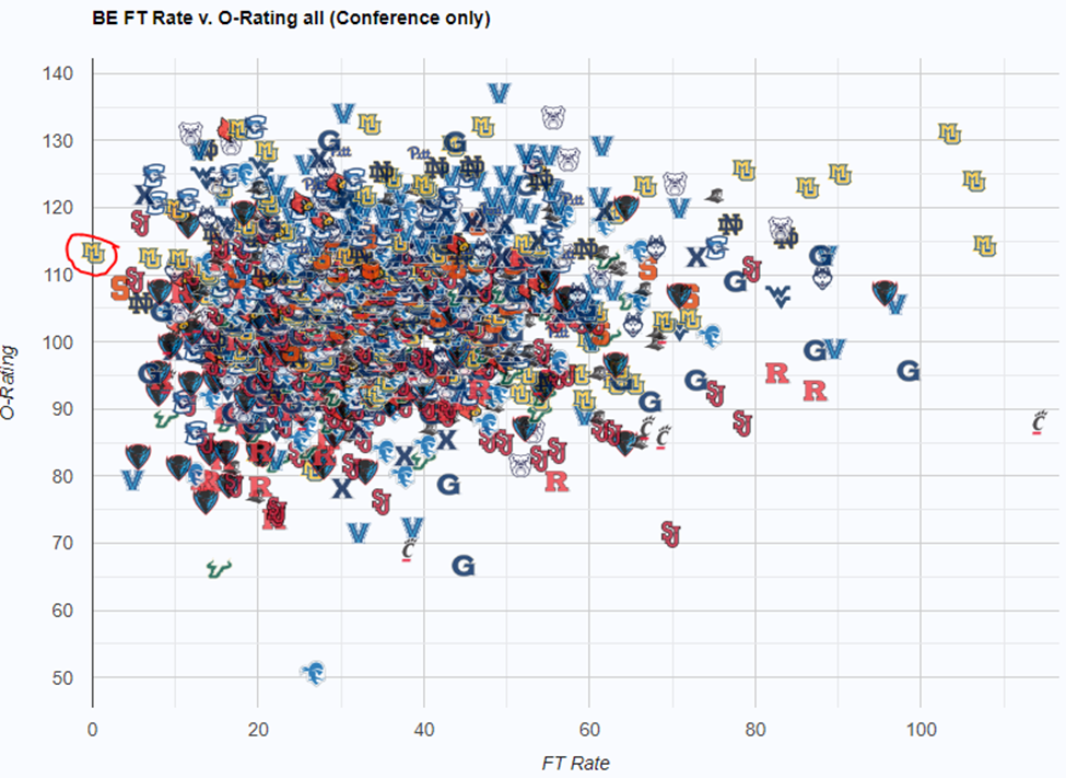 Since 2008, 1,177 players have notched at least 40% of minutes in Big East play and Kam Jones was the one and only to not put up at least 1 free throw in that time. That’s almost unfathomable and something he probably couldn’t replicate if he tried. Only 4 high major players (since ’08) can say that.