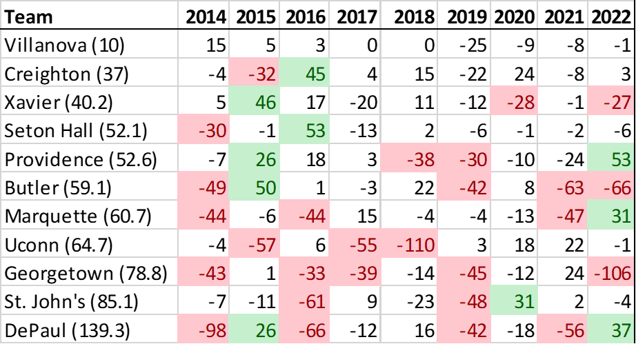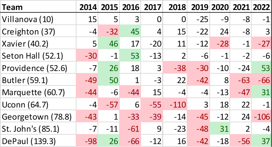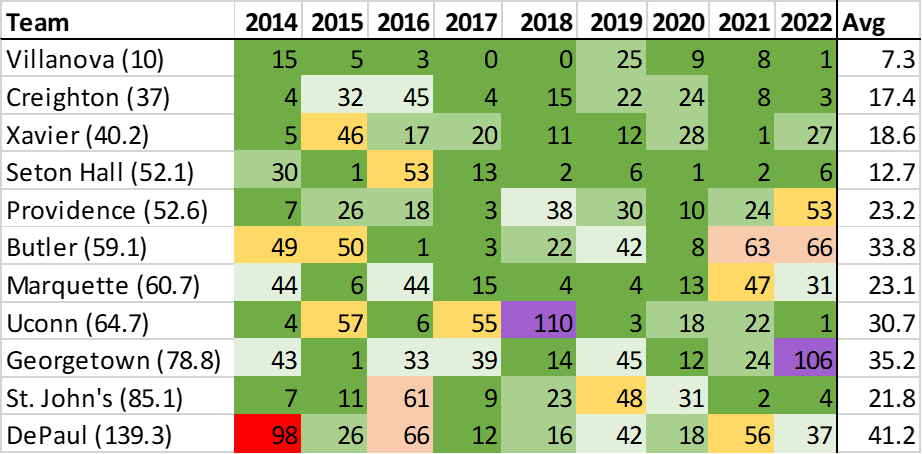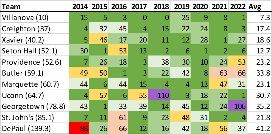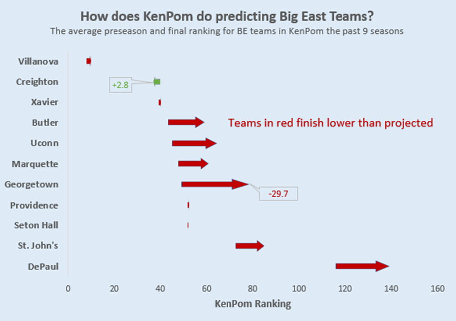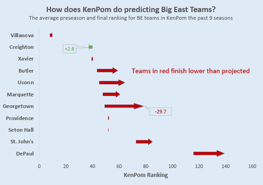 As it turns out, since the reformation, KenPom’s preseason rankings have consistently overvalued most Big East teams. Only Creighton has averaged a higher finish than its preseason projection, and even that was only by 2.8 spots. The average Big East team finished 17 spots below where they were pegged before the season started.