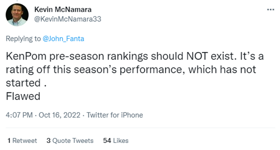 Which gets us back to our original point. No system is going to be perfect. There are too many variables across 350+ teams over 6+ months that no algorithm will be able to model with perfect accuracy before even a game is played. I think that’s Kevin’s original complaint.