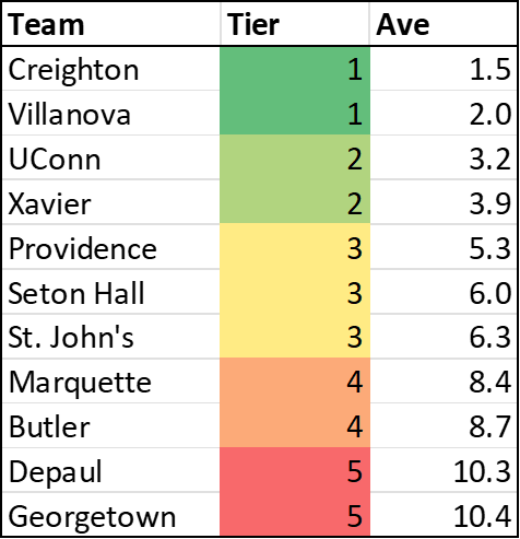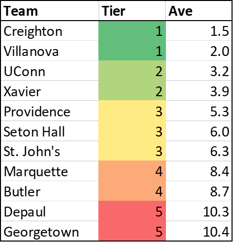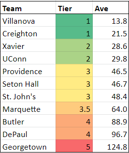 Unlike the Big East ones, you can see the clear gap between Butler and Marquette, as well as between DePaul and Georgetown. And there’s basically zero difference between Providence, Hall or St. John’s. Something to keep a close eye on this season.