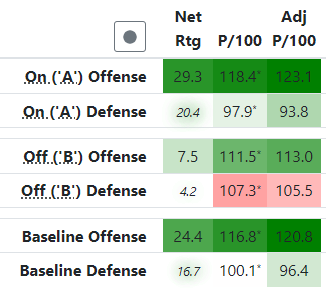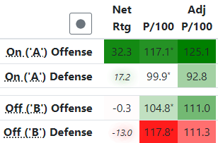 Of course, On/Off is impacted by a lot of different factors. How many possessions you see (sample size). Who you play with (starters v bench). Who you play against. Nevada Smith has consistently railed against plus/minus as a value indicator, because it’s much more of a team measure and less an individual merit.