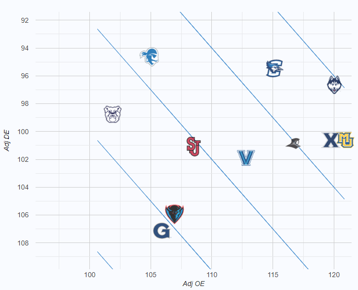 This also gives us a good way to group teams into tiers, with the top being a jumble of 4 tightly grouped teams (plus Providence lurking just behind).