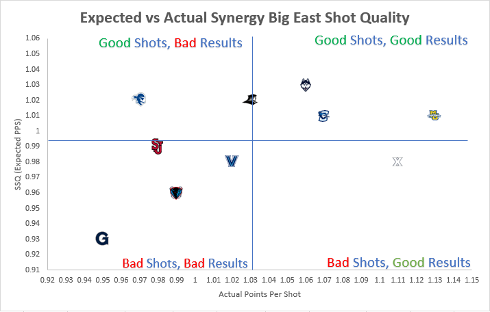 Synergy rolled out a new feature this year that tracks the quality of the shot taken, based on a myriad of data points, so I’ve kept track of the offensive side of the ball the whole season. Marquette remains an offensive standout in pretty much any type of analysis.