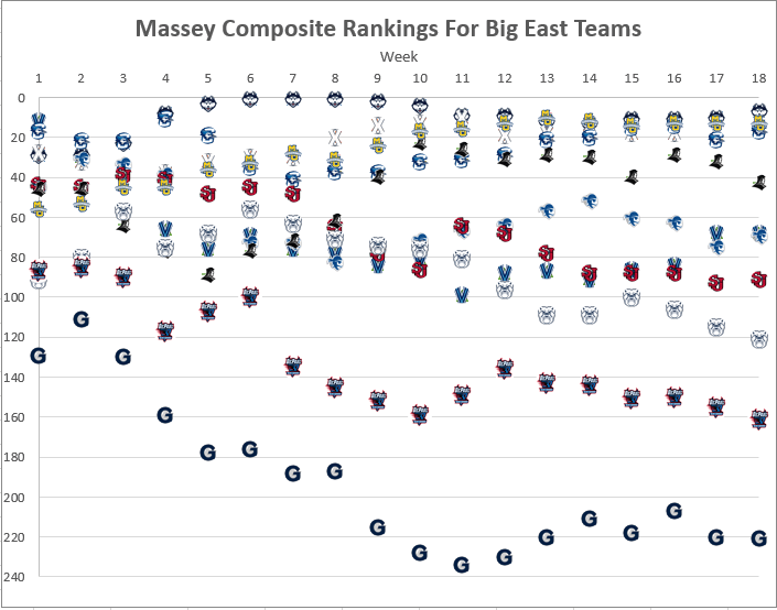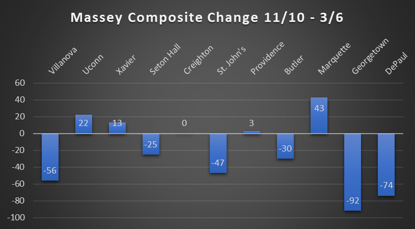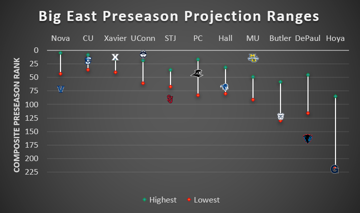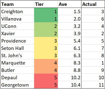 Nobody in the country had Marquette in the top-40, and yet they finish in the top-15. Similarly, nobody envisioned Villanova or DePaul being quite this bad.