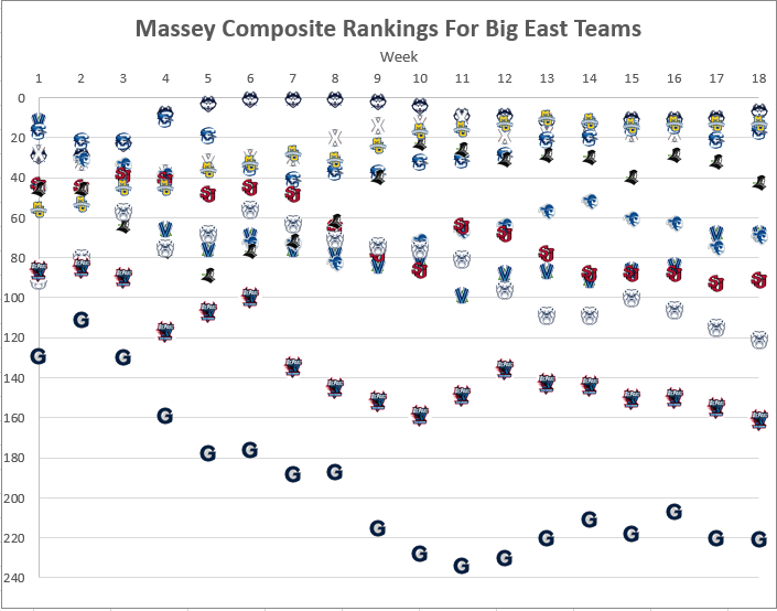 To be honest, the composite Big East standings only had 2 big misses. MU jumping into the first tier with Villanova dropping into the middle tiers. This is why it’s smart to see the projections not in isolation, but in aggregate.