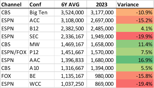 You’d expect FS1 to be lowest and it is by a significant margin, drawing 612,000 viewers for a 10pm tip in 2018. It’s lone FOX appearance came in 2022, with the Big East as the lead in to a 9pm tip, and it drew 1,3M that year. In the other 4 seasons, the title game, despite starting after 10:45pm ET, has averaged 1.69M viewers.
