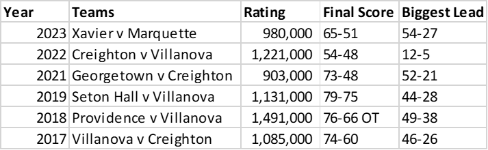 What I can say with certainty is that Villanova does stand apart from the rest of the league. It’s run of dominance and NCAA titles has brought with it a national audience that does move the needle. Not having Villanova hurts ratings. (The same can be said for UConn to a bit of a lesser extent.) Not having a close game hurts ratings. Everything else you can quibble with on the margins.