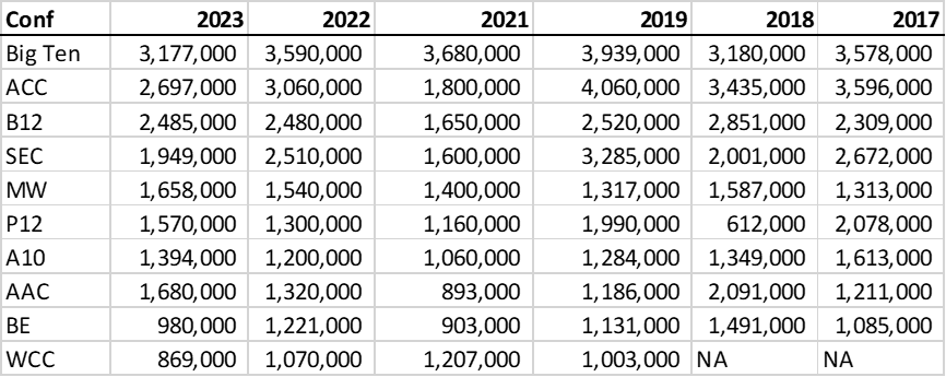 You’d expect FS1 to be lowest and it is by a significant margin, drawing 612,000 viewers for a 10pm tip in 2018. It’s lone FOX appearance came in 2022, with the Big East as the lead in to a 9pm tip, and it drew 1,3M that year. In the other 4 seasons, the title game, despite starting after 10:45pm ET, has averaged 1.69M viewers.
