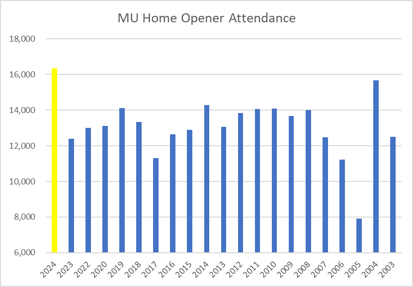 And in fact the 2004 opener, with the Final 4 banner raising, was the only other opener to surpass 15K, hitting 15,659. But that was 20 years ago. In today’s environment, with the Bucks an NBA title contender and NCAA attendance steadily dropping every year since, seeing a number surpass that total is mind blowing.