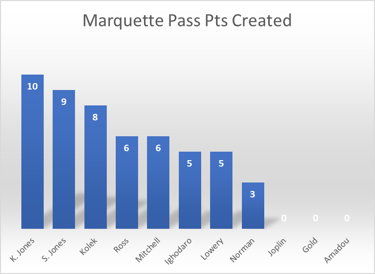 On Monday, I thought Sean Jones played very well and got other in scoring position often, but the 3 assists didn’t really reflect that. With Passing Points Created, we can see he was 2nd best on the team, only behind Kam.
