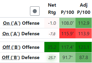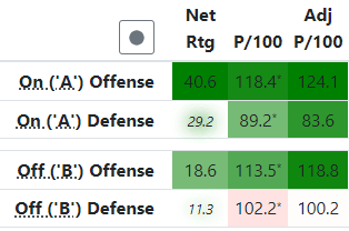 The way to read that chart is that Marquette’s net rating (how many points the offense scores subtracted with how many it gives up per 100 possessions, adjusting for opponent quality and filtering out garbage minutes) is a full 22 points better in the time Stevie is on the court, compared to when he’s off of it. (The little numbers in italic are raw net rating, not accounting for opponent.)